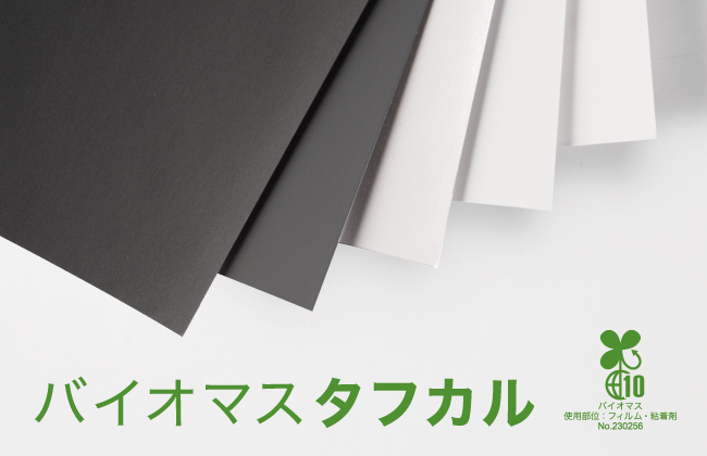 屋外用装飾フィルム「タフカル」にバイオマス(※1)を10%配合した「バイオマスタフカル」が新登場しました。フィルム・粘着剤の10%がバイオマス由来の材料で構成されており、化石燃料の使用を削減することができます。これにより、温室効果ガスの排出量を低減し、地球温暖化対策に貢献します。