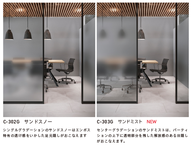 フォグラスのエンボスがそのままドットグラデーションになったエンボスグラデーション。現在、販売中のC-302G サンドスノー(シングルグラデーション)に加えて、センターグラデーションタイプの「C-303G サンドミスト」が新発売。