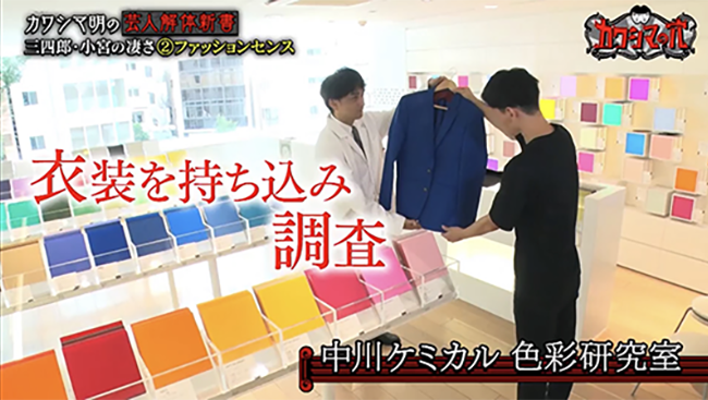 2023年9月24日(日)放送のテレビ番組「カワシマの穴」(日本テレビ)にて、弊社、色彩研究室がVTR出演致しました。スタジオゲストに芸人の三四郎・小宮浩信さんがご出演し、小宮さんの凄さをVTRでご紹介されました。その中で「小宮さんの青いジャケットの小宮ブルー」について深掘りされました。そこで実際にそのジャケットを色彩研究室に持ち込み数値を測定し、色について調べるという内容でした。