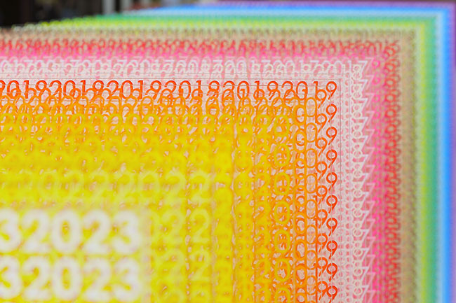 100色で彩られた層が織りなす、記憶を辿るインスタレーション。小さな数字が幾重にも重なり合い、年号が浮かび上がります。西暦が刻まれた100色の層は、奥に流れるにつれて年月が遡る「記憶」を視覚化します。一番手前の層は2023年現在の新たな記憶を「白」で表現し、100色のグラデーションが過去の時の流れを演出します。この色とりどりな記憶の空間に人々が集まり、思い出に思いを馳せる場所となりますように。