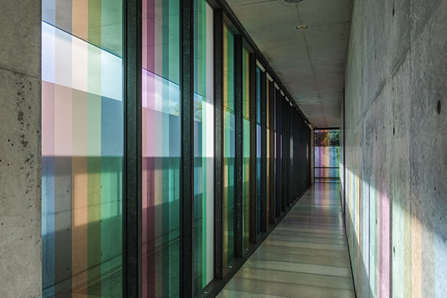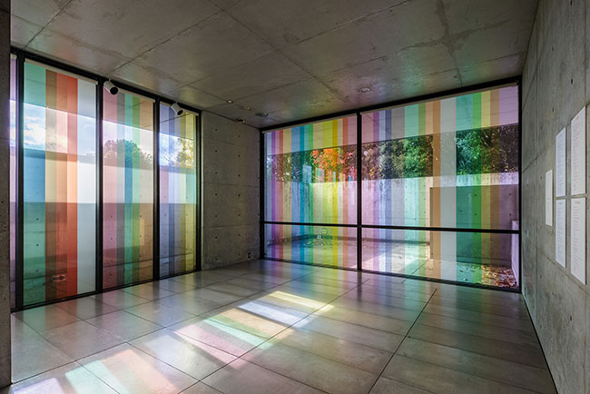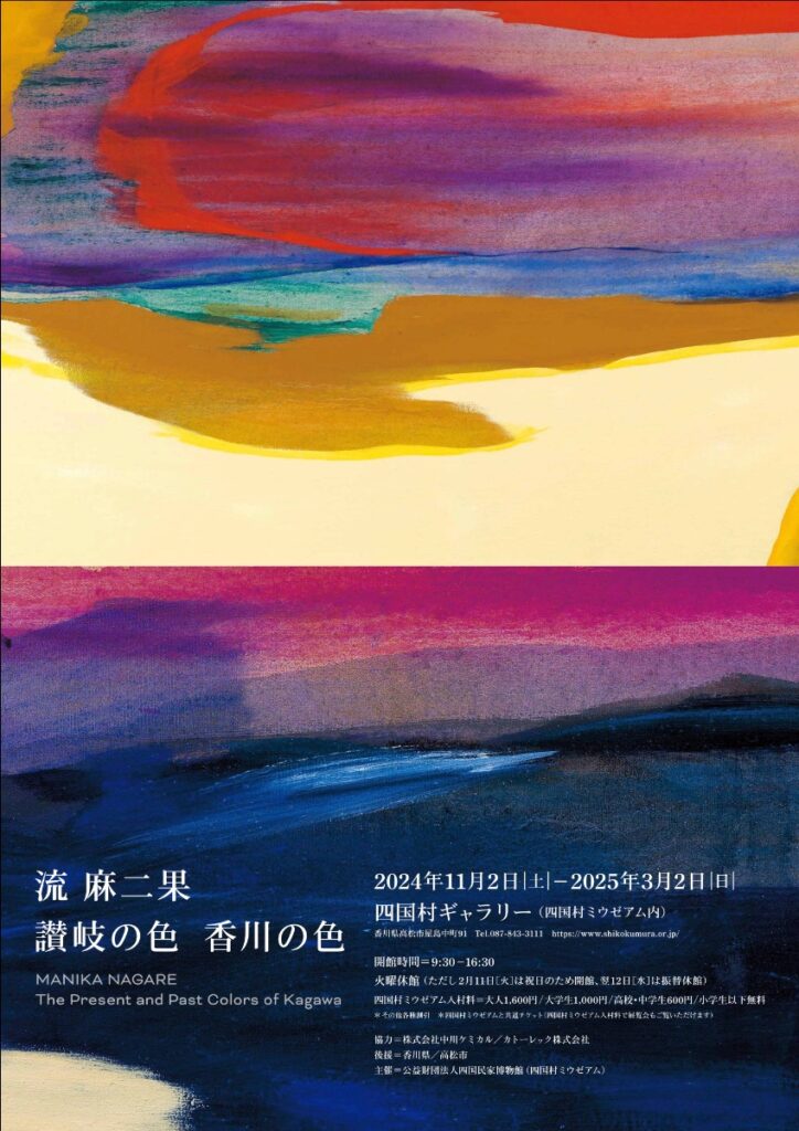 香川県出身の現代アーティスト流麻二果が、色を通じて現在を起点に過去を遡り、讃岐の昔と香川の今を繋ぎます。かつて八島と呼ばれた屋島からの眺望に遥か昔の「讃岐の色」を想像して八枚の連作で描いた新作《八島の色》の展示に加え、地元の中高生と現代の「香川の色」について考えた成果をインスタレーションとして展開します。四国村ギャラリ―の細長い光の廊下のような建築の特性を活かし、色が通り抜けるような絵画群と重ね色が透過した光で埋め尽くされるインスタレーションによって、色の光廊を実現します。展示空間のガラス面にIROMIZUをご使用頂きました。是非ご覧ください。
