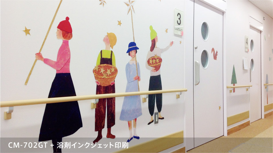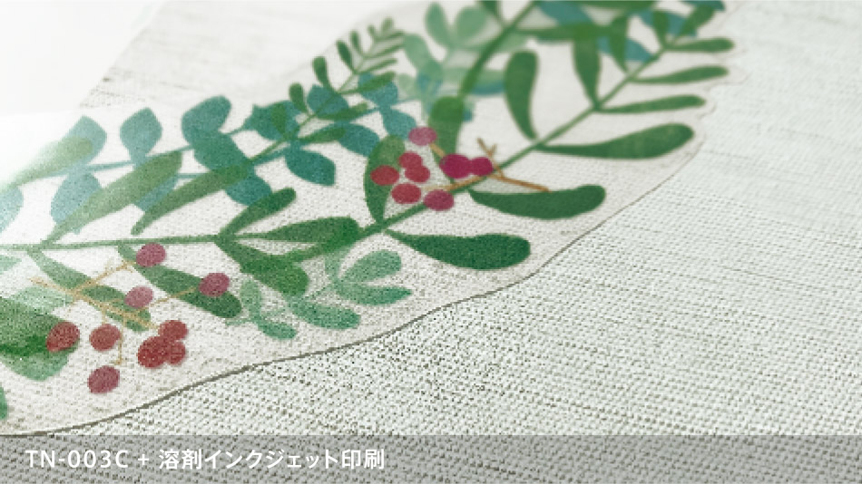 平滑面だけでなく、壁紙やクロスなどの粗面にも施工可能な強粘着のインクジェットメディアです。オーソドックスな白色の「CM-702GT」は裏面の色がグレーのため、下地の色や模様に影響されることなく印刷表現が可能です。無色透明の「TN 003C」はベニヤや布生地など下地を活かしながら、上から装飾を追加することができます。