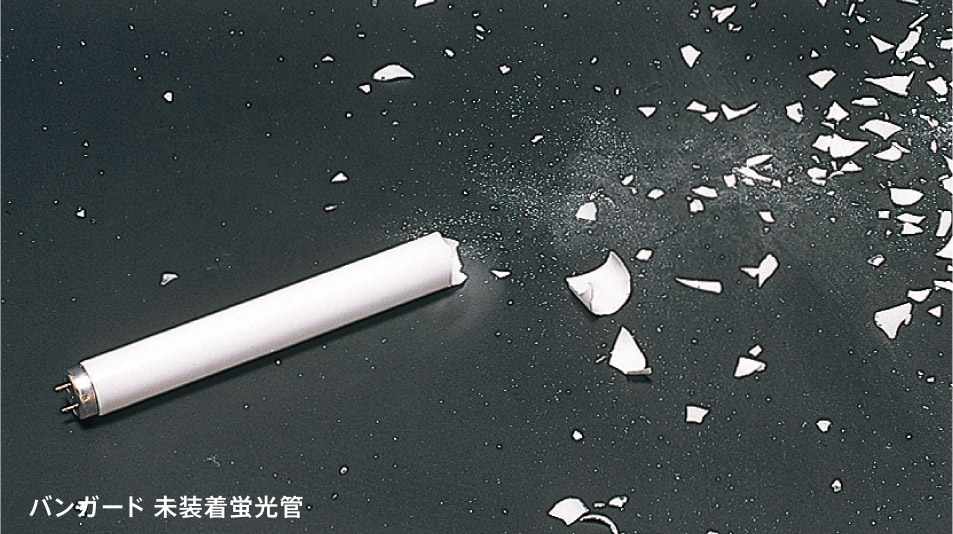 バンガードは、蛍光灯に取り付ける無色透明の後付けカバーで、既存の蛍光灯を強力な飛散防止タイプに変換します。両端をシリコンキャップで固定することにより衝撃に強く、万一落下しても破片が飛び散らないことから、照明器具のHACCP対策・地震災害対策としてご利用いただいております。