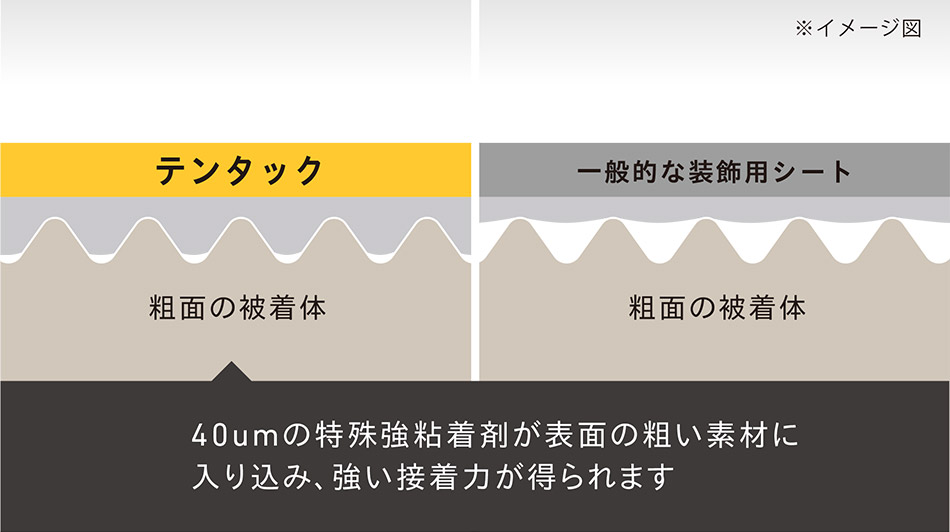 テンタックの粘着剤は40μmの厚みがあるだけでなく、特殊な強粘着剤なので、表面の粗い素材にも貼り付け可能です。一般的な装飾用シートの貼り付けが難しい場所でも、ご活用いただけます。