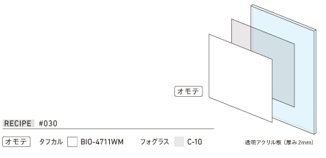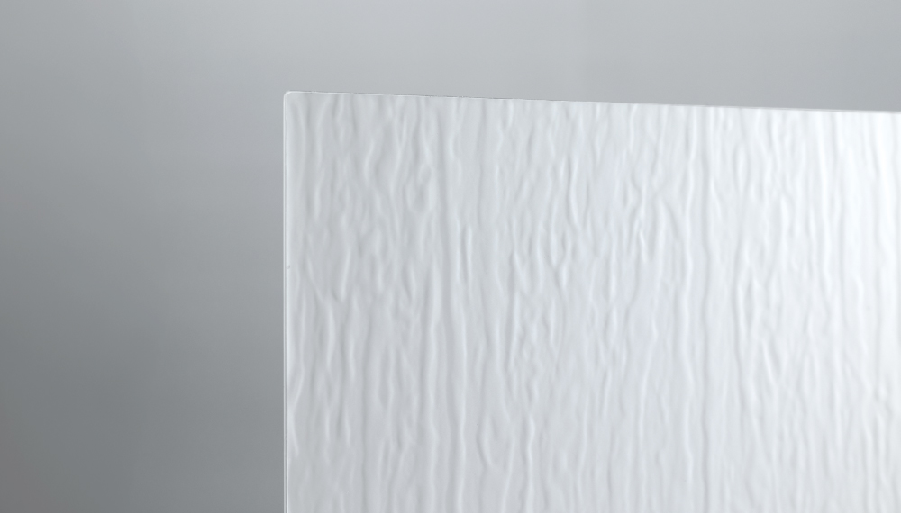 波ガラスのような趣深いテクスチャが魅力のアンティークガラス調フィルム「C-10(カスケード)」の上に、「タフカル」を貼り合わせた表現です。「タフカル」が下地のテクスチャに追従することで、通常のシートでは再現できない独特の表情を生み出します。