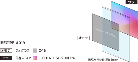 表面はスリガラス調シート「フォグラス」、裏面は透明メディアにグラデーションを溶剤印刷したシートを組み合わせることで、独自のぼかし表現を作りだせます。「フォグラス」の柔かくぼやけた透過感と、滲むようなグラデーション印刷がつくる繊細な表現をぜひお役立てください。
