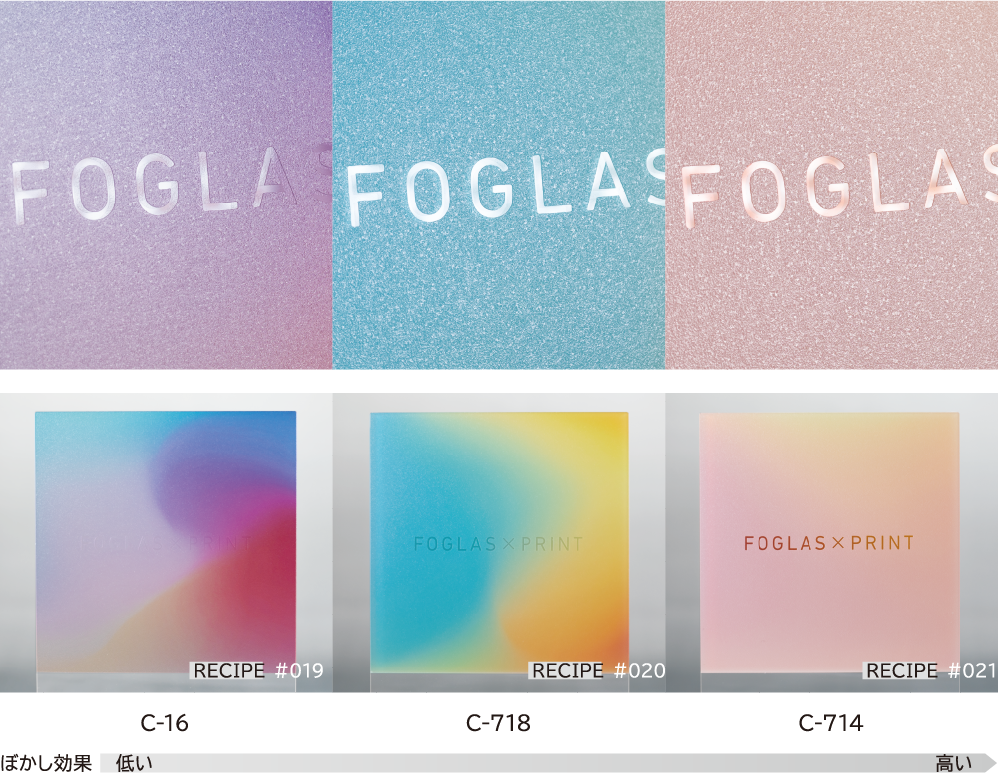 透過度が異なるスリガラス調シートを使用することで、透け感を自在にコントロールできます。C-16→C-718→C-714の順に白色が濃くなり透明度が低くなるため、裏面の印刷グラフィックに与えるぼかし効果も段階的に強まります。この調整により、グラデーションの柔らかな変化や奥行きを演出できます。