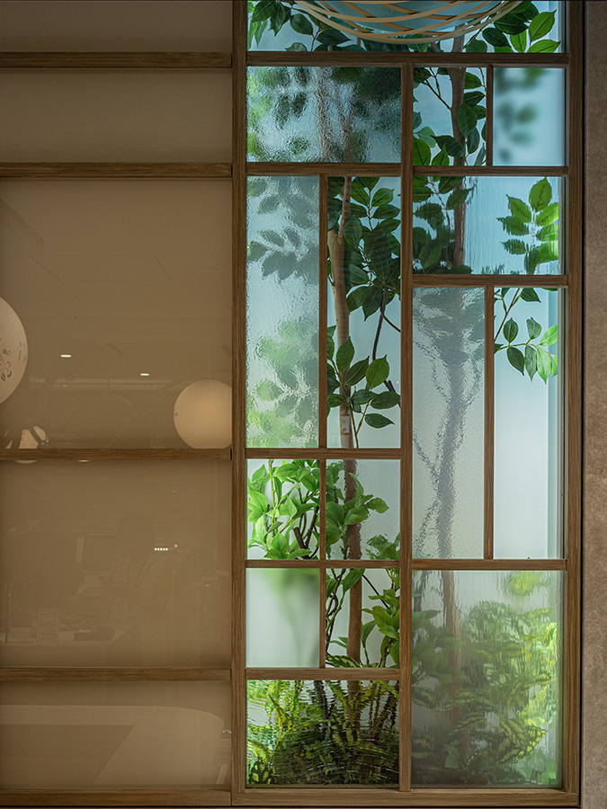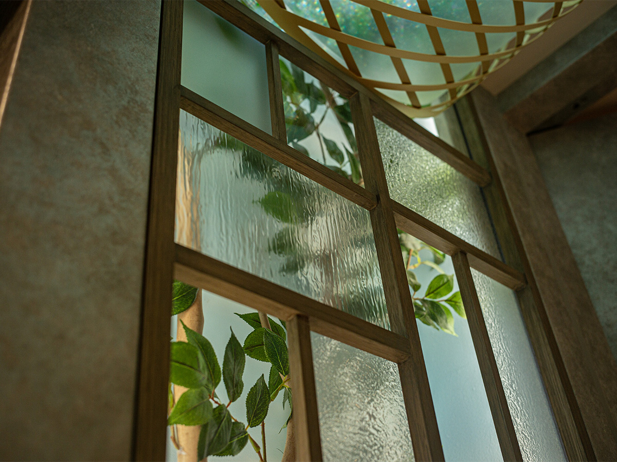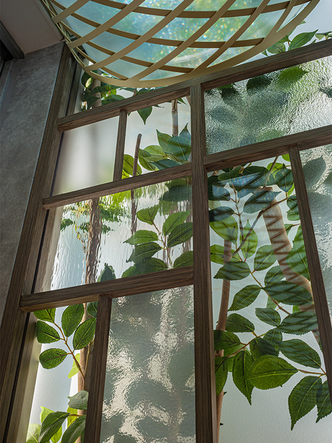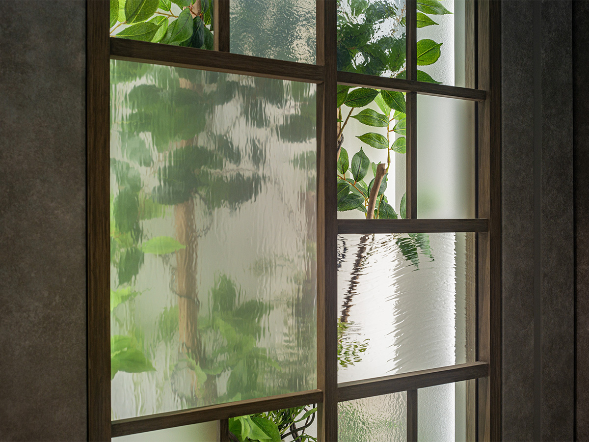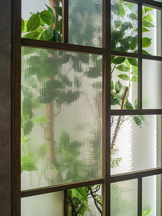 設計:㈱JR東日本建築設計 東京駅内にあるグランスタ東京のガラス面にて弊社のシートをご使用いただきました。 波ガラスのような趣きのあるテクスチャーが特徴のアンティークガラス調フィルム「C-10 カスケード」や、透明色シート「IROMIZU W-25ic(白)」を重ねることで奥行き感のあるデザインとなっております。