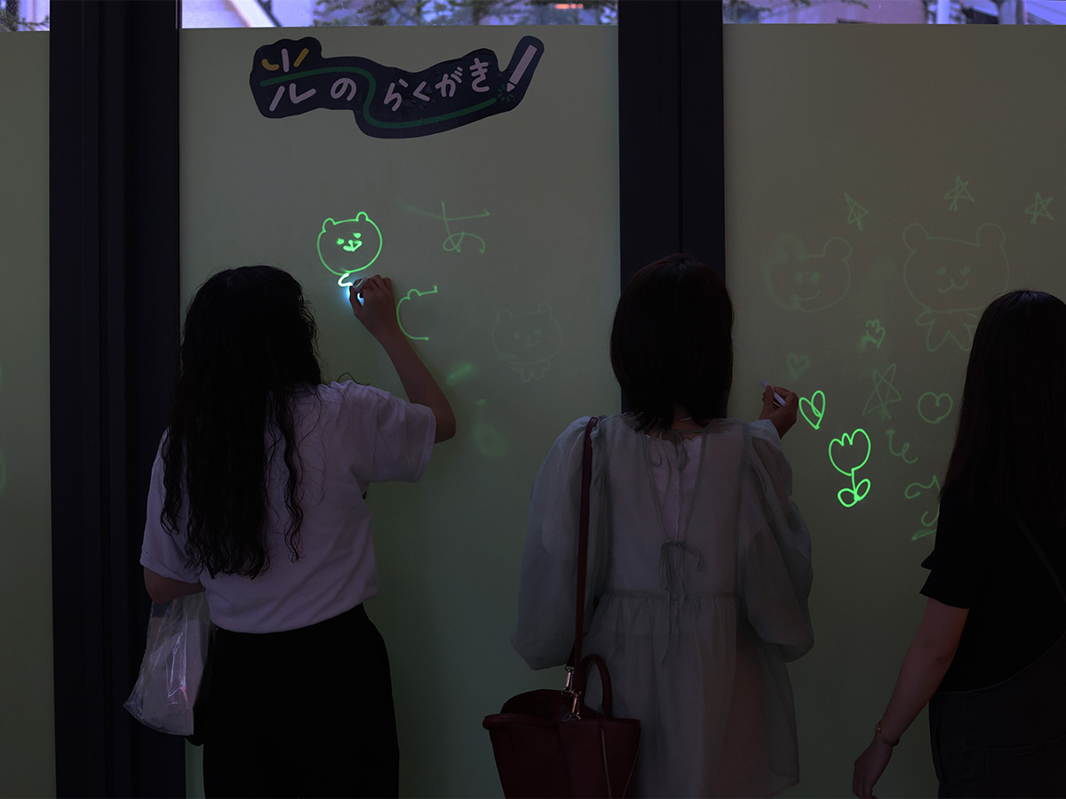企画:株式会社GREENING 施工:クラフトワーク 展示期間:2024年9月13日〜29日 東京・下北沢の街を舞台にしたアートフェスタ「ムーンアートナイト下北沢2024」 reload エントランスホールのガラス面を透明色シートIROMIZUで鮮やかに装飾しました。施設内にある24店舗の「色」を表現しております。また、夕方以降は蓄光シートを使用してライトペンで絵を描く「光のらくがき」も行われました!