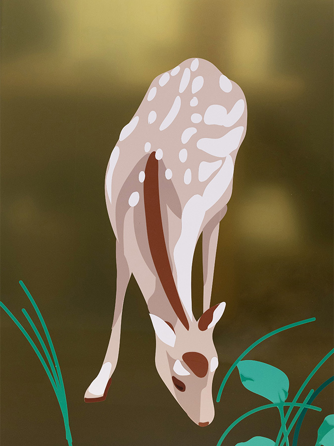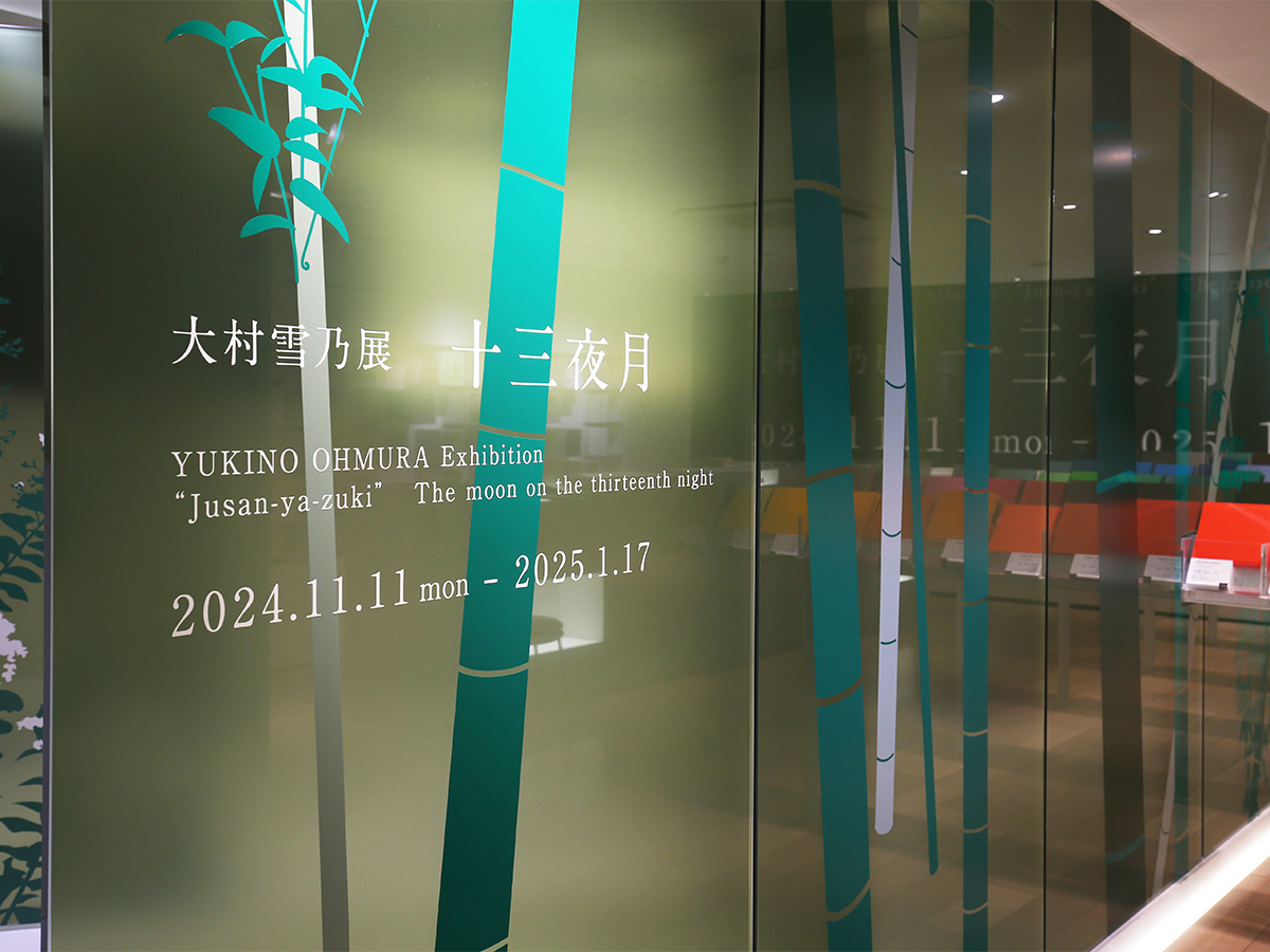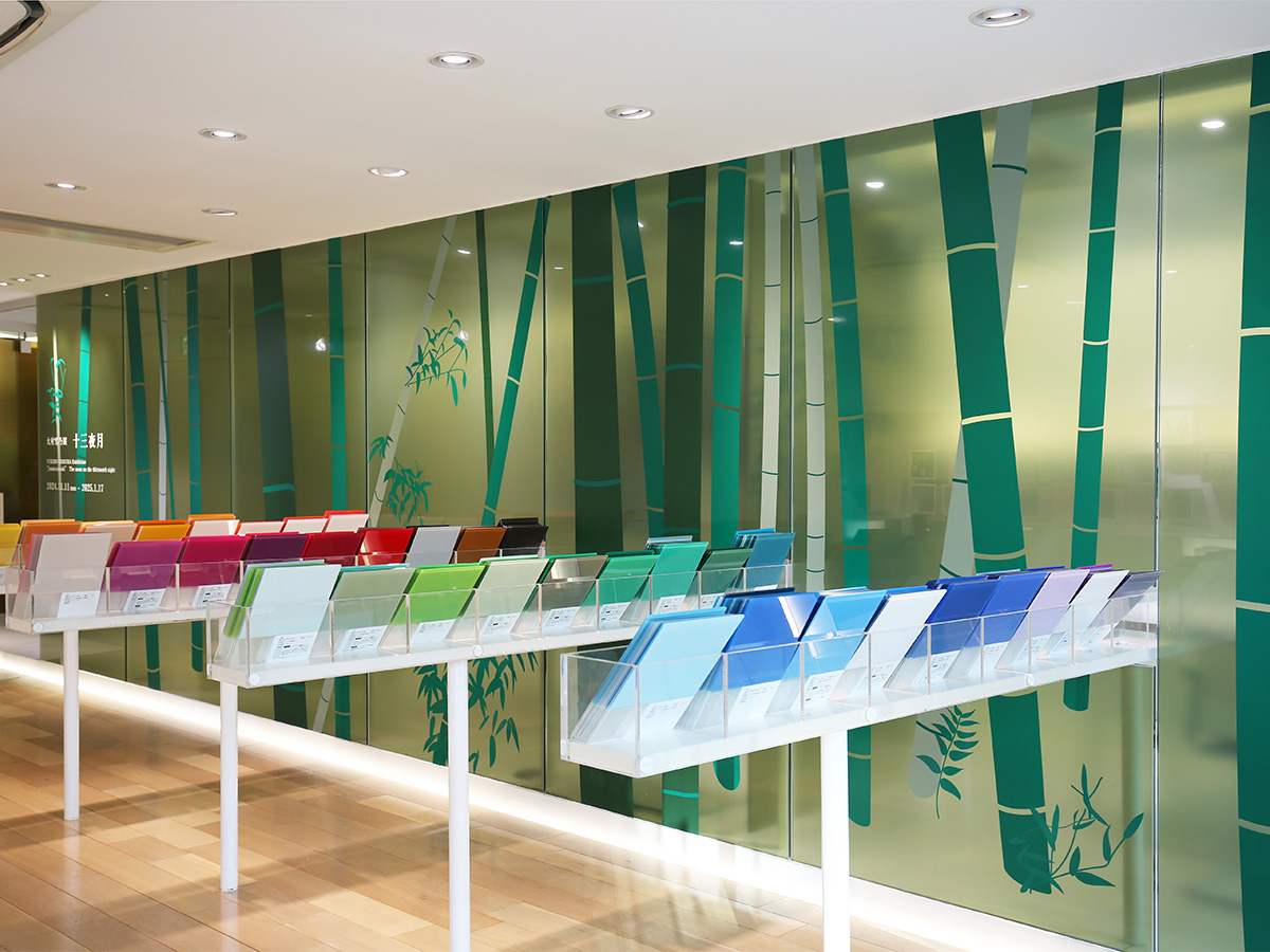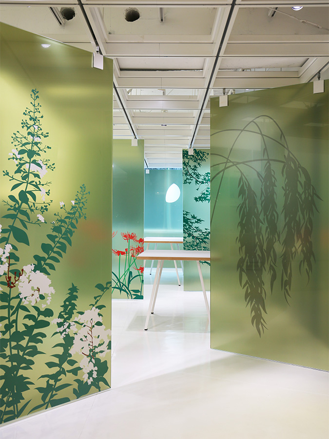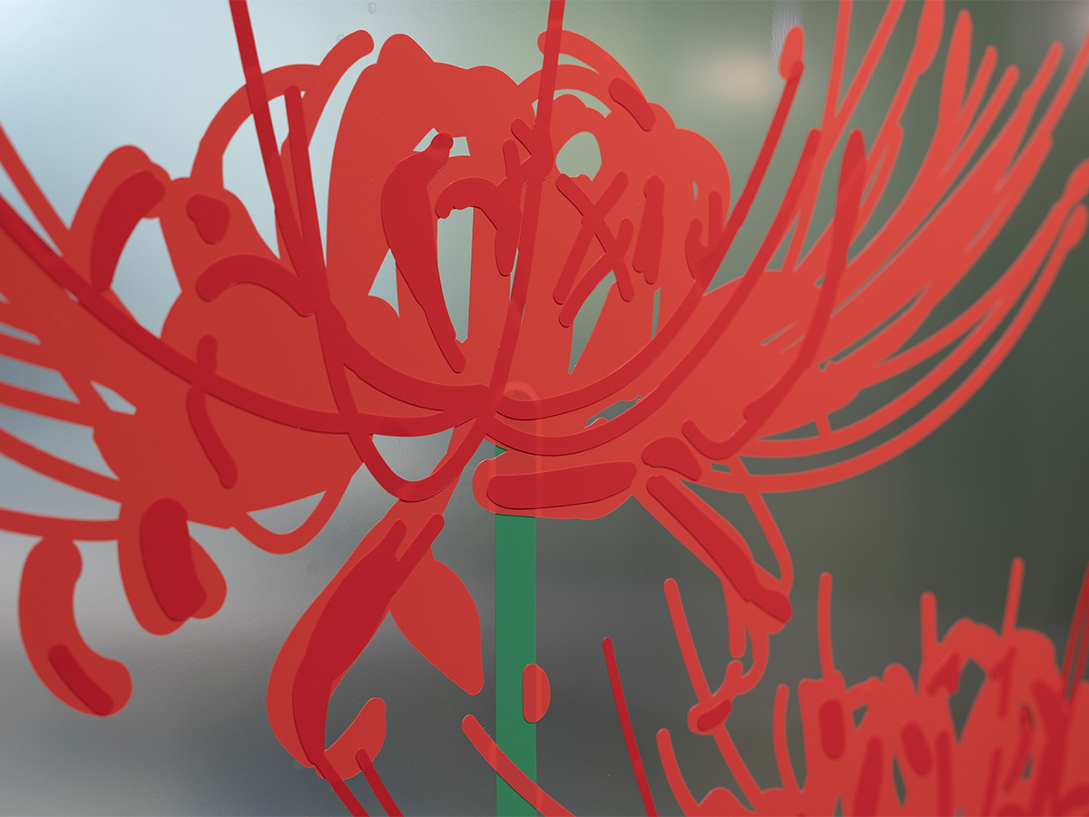ショールーム内の可動ガラスには月やヒガンバナ、モミジなどの秋のモチーフをシートで装飾しております。背景色には、透明装飾用シート IROMIZUとスリガラス調フィルム フォグラスを重ね貼りしております。後ろにある景色がぼんやりと透けて見えるようなデザインによって作品の世界に没入できるような空間となっております。