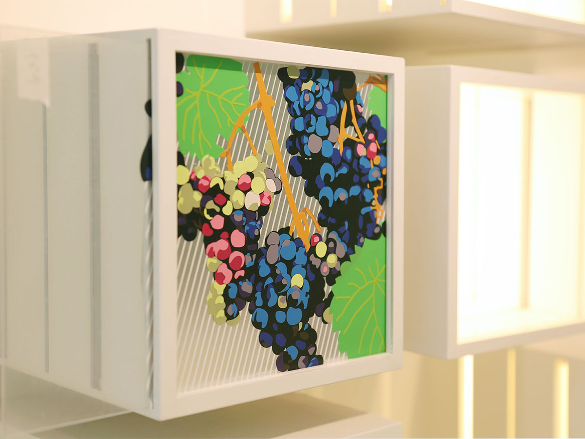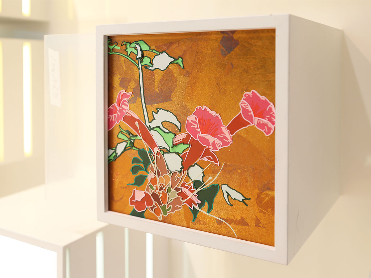 ショールーム奥側のライティングボックスでは、草花をメインに複数のシート(カッティングシート、ノックス タフカル、IROMIZU、マテリオ)を重ね貼りした作品。