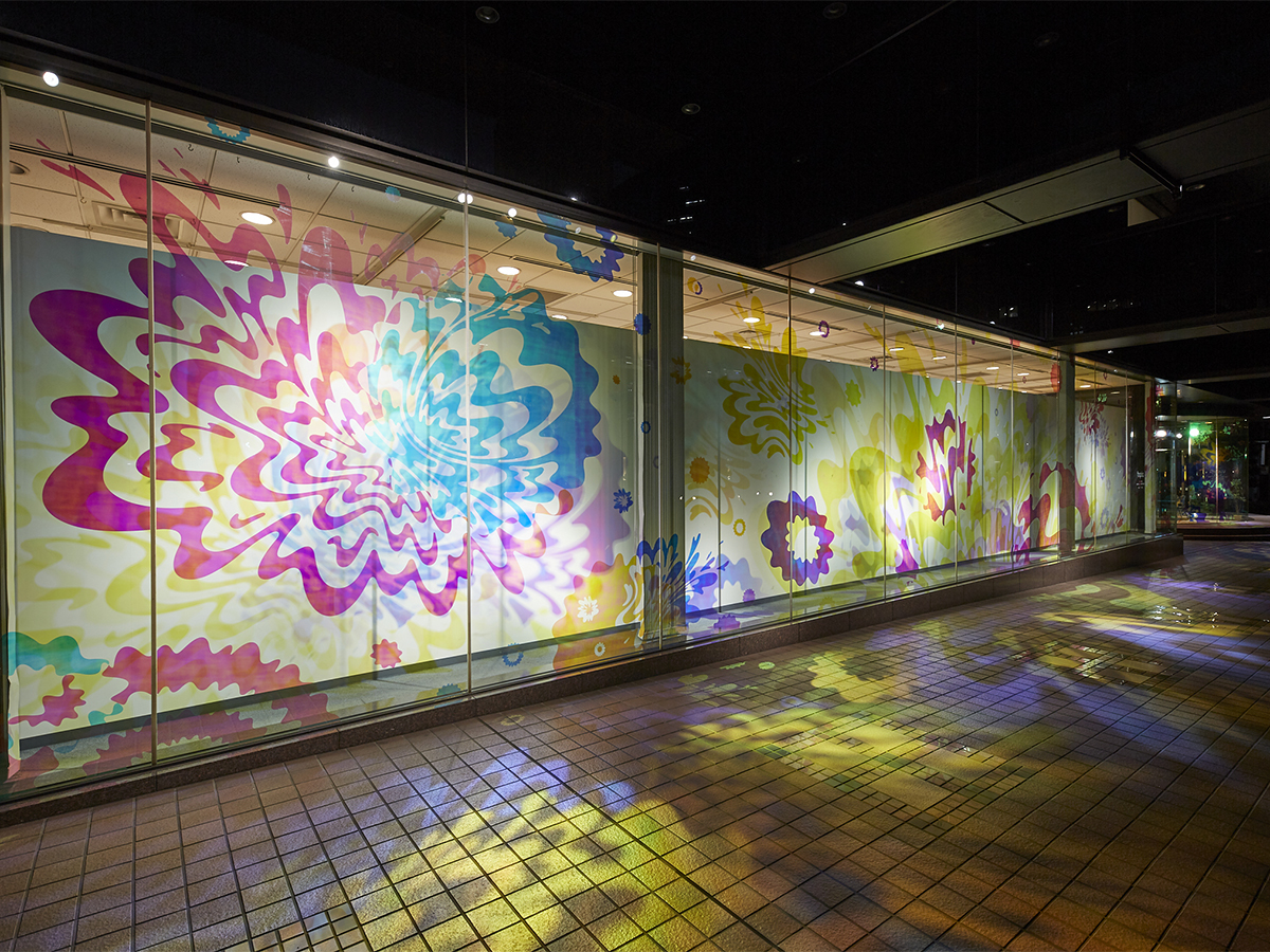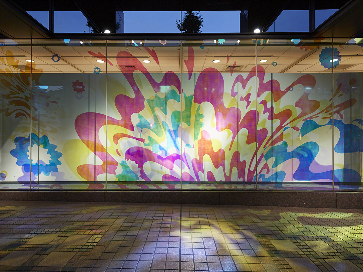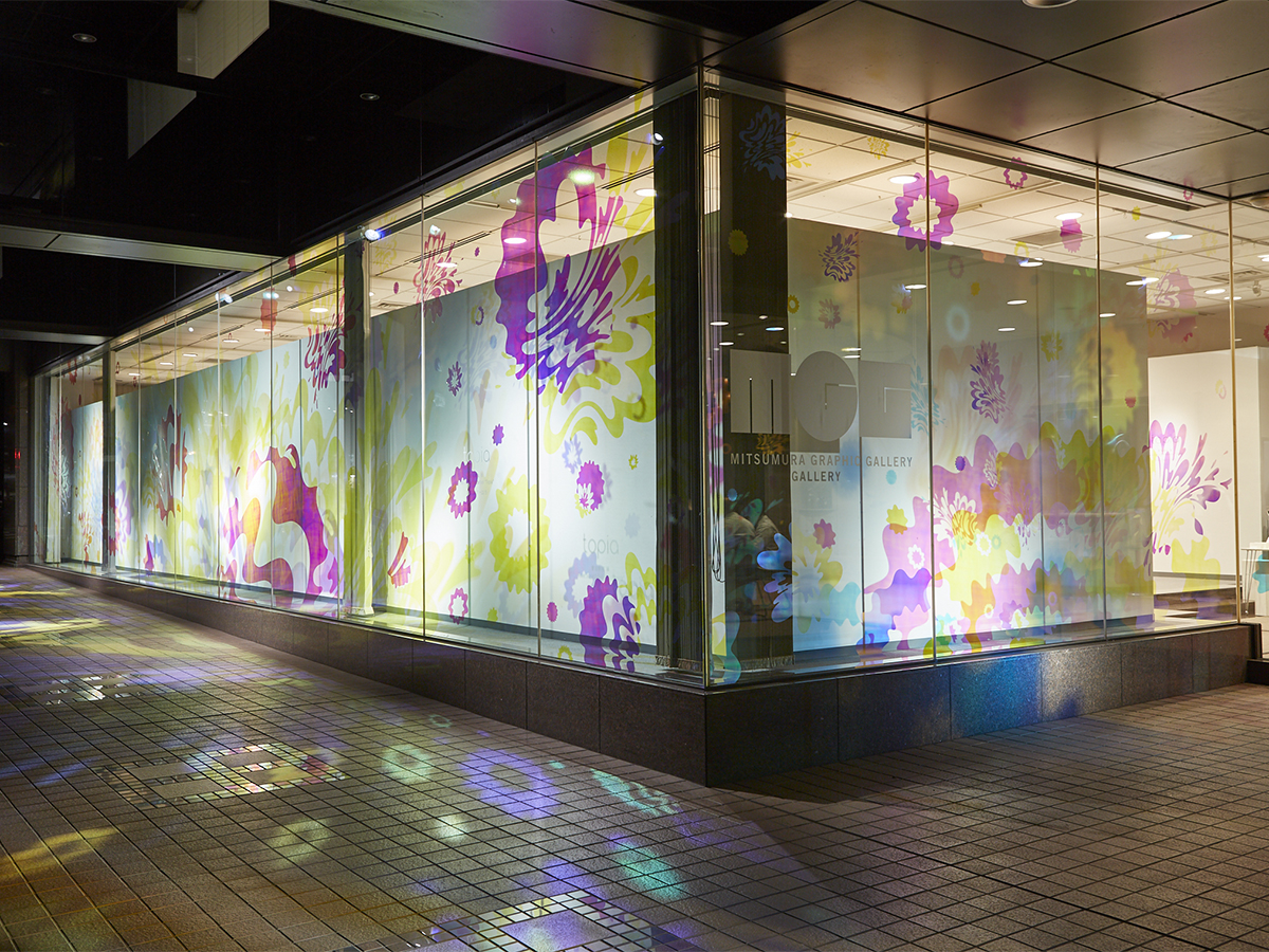 アーティスト:曽谷 朝絵 照明デザイン:萩原 克奈恵 写真:Yasuyuki Kasagi 会期:2022年10月7日〜11月5日 光村グラフィック・ギャラリー(光村印刷株式会社本社ビル1階)で、曽谷朝絵さんの個展「Topia」が開催されました。ギャラリーを取り囲む長さ35メートルのガラス面をセプテットフィルムで装飾しました。夜間のライトアップによって床に落ちる影は、様々な色を浮かび上がらせ、とても幻想的な空間となっております。