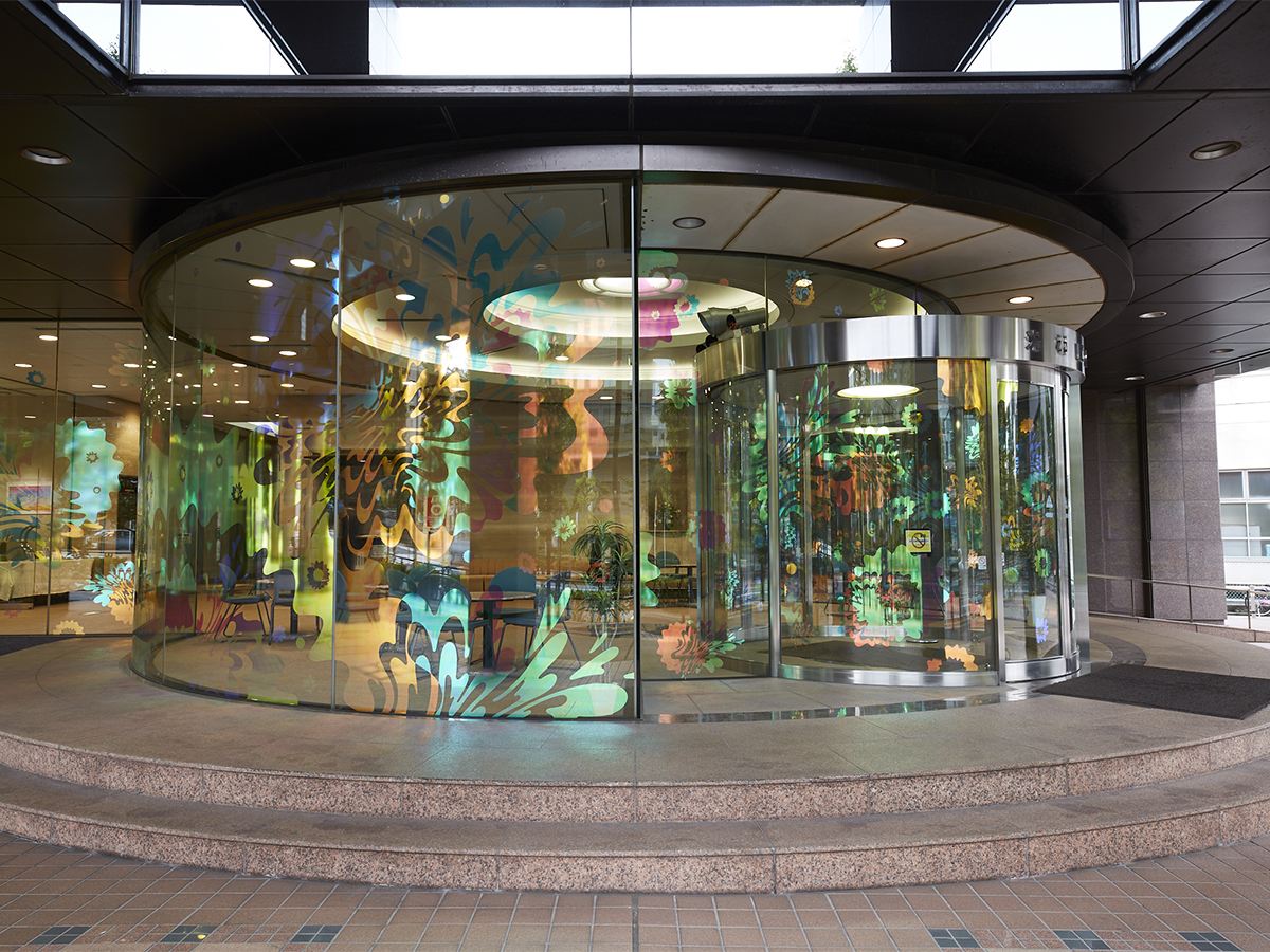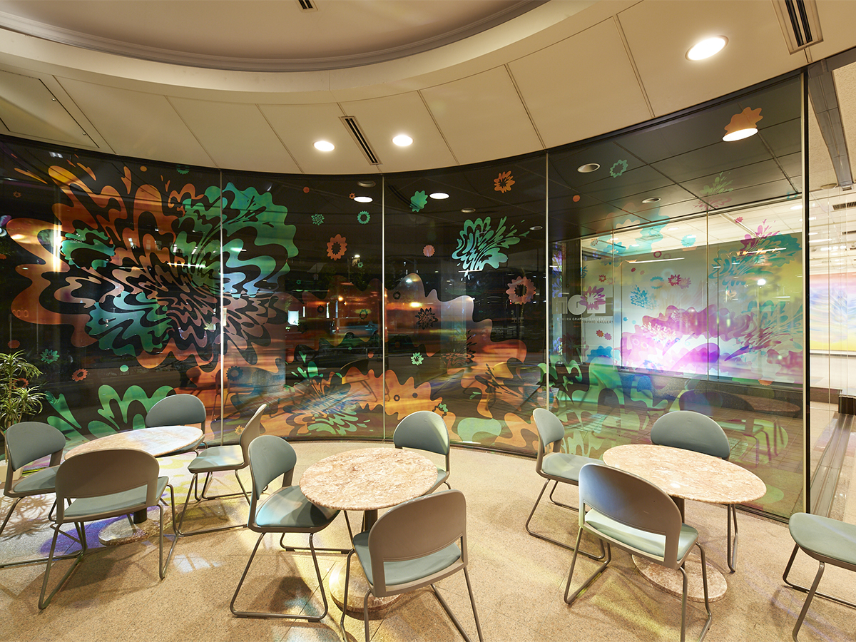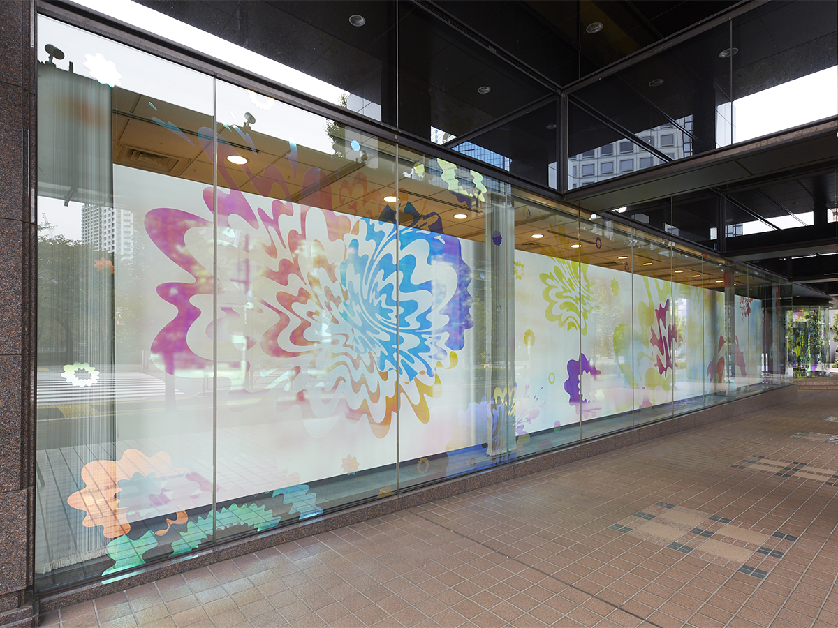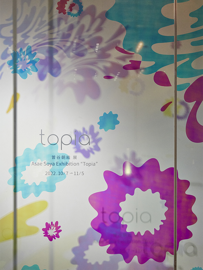 アーティスト:曽谷 朝絵 照明デザイン:萩原 克奈恵 写真:Yasuyuki Kasagi 会期:2022年10月7日〜11月5日 光村グラフィック・ギャラリー(光村印刷株式会社本社ビル1階)で、曽谷朝絵さんの個展「Topia」が開催されました。ギャラリーを取り囲む長さ35メートルのガラス面をセプテットフィルムで装飾しました。夜間のライトアップによって床に落ちる影は、様々な色を浮かび上がらせ、とても幻想的な空間となっております。