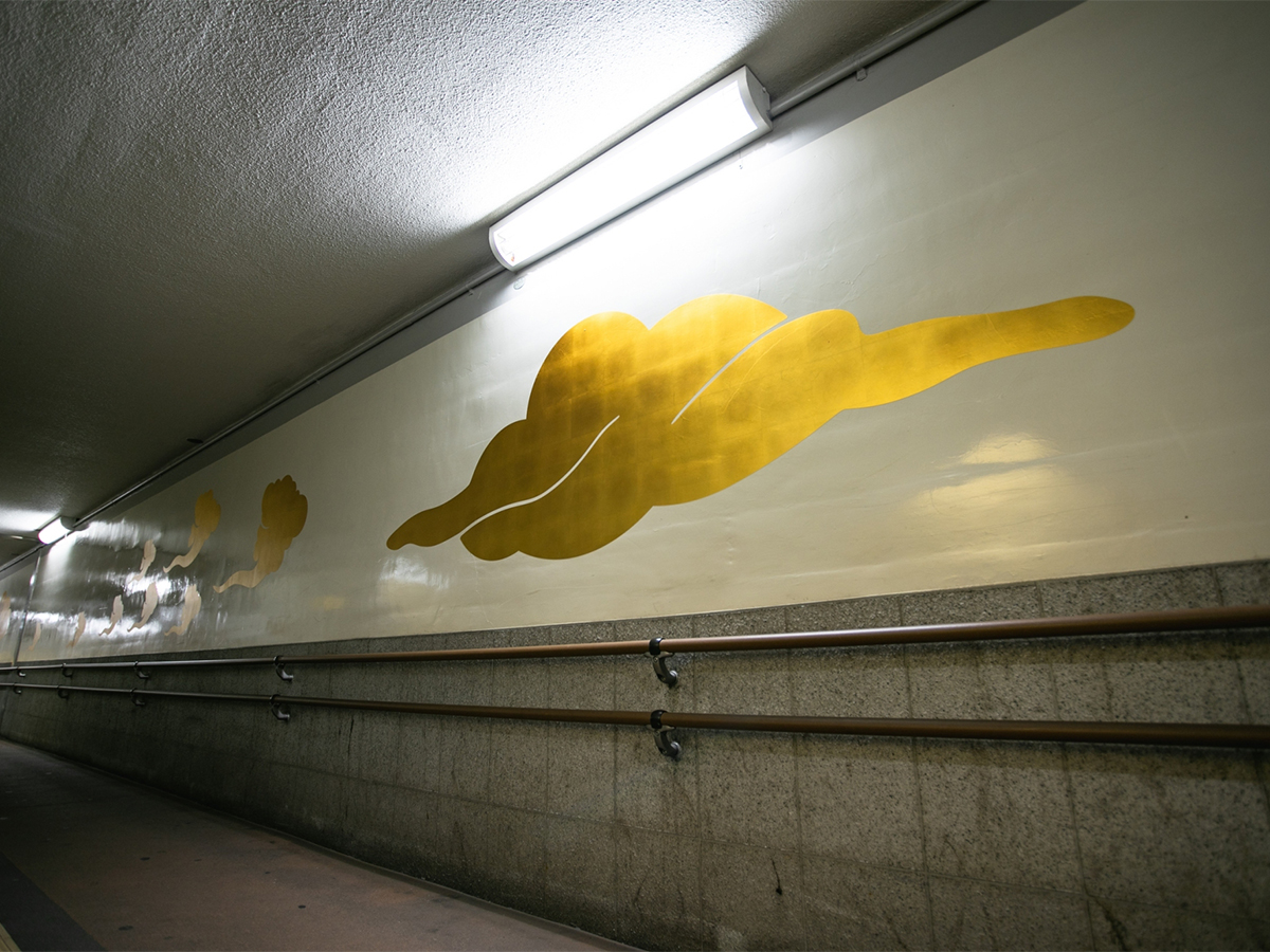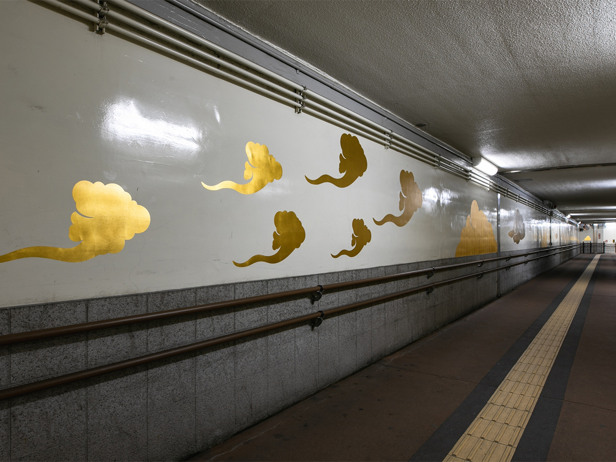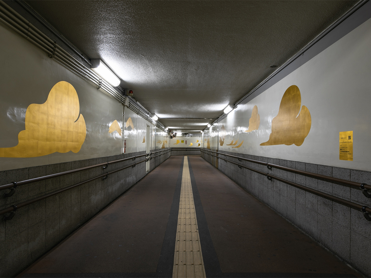 山陽本線広島駅から西へ2駅目の横川駅を中心とするエリアはかつて広島を代表するモノづくりの町であったこともあり、アートやデザインに対して大変積極的な地域です。横川駅の南北を結ぶ約60mの地下通路は、かつて駅工事の際に設けられた作業用通路を地元住民に開放したために、殺風景で暗く夜の通行は避けたいという住民の声から、どうにか通路を明るくできる方法はないかと模索した。照明工事が出来ない条件から日本伝統建築にヒントを得て箔をしつらえる手法を提案。箔の反射が蛍光灯の青白い光を暖かな色に変えることを目指した。生活道路になっていることから封鎖の許可がとれないことから、短時間で箔を施工する方法としてMATERIO BLS-001 洋金箔シートを用いて施工とした。