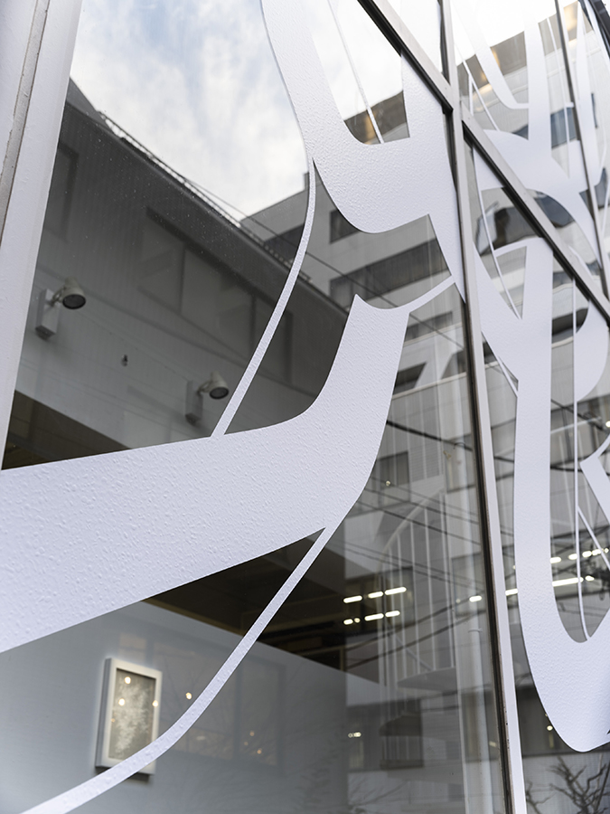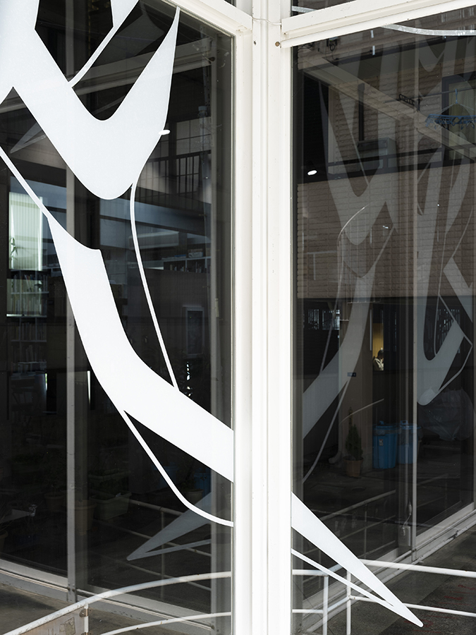 大山の独自のモティーフである「クイックターン・ストラクチャー」のアートワークを建物の形状にあわせてレイアウトしている。窓ガラスの枠を超えてアートワークが施されている部分は、トタン板をモティーフにデザインされた波打つガラス壁に沿うようにカッティングシートが貼られており、建物との一体感が際立つ。