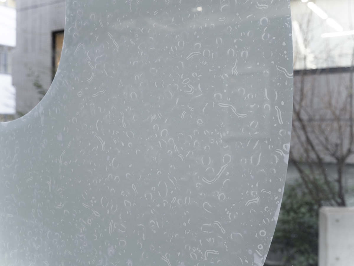 本展は「Paint Blister」(ペイントブリスター)と呼ばれる、塗膜と支持体のあいだに生じる気泡やふくれに着目した展覧会となっており、カッティングシートの施行では通常避けるべきこの気泡(ブリスター)をあえて発生させるために、凹凸のあるシート(C-09(RYUKYU))の上に白いシート(711)を重ねることで、店外からはシート表面の微かなふくれが、店内からはシート裏面の気泡を見ることができる作品となっている。